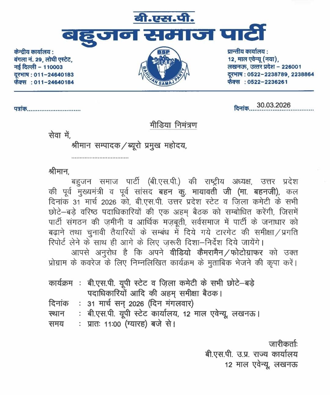 बसपा प्रमुख ने लखनऊ में पदाधिकारियों की बैठक बुलाई है, जिसमें संगठन की मजबूती, आर्थिक स्थिति और जनाधार बढ़ाने पर चर्चा होगी। आगामी चुनावों की तैयारियों की समीक्षा के साथ प्रगति रिपोर्ट ली जाएगी।