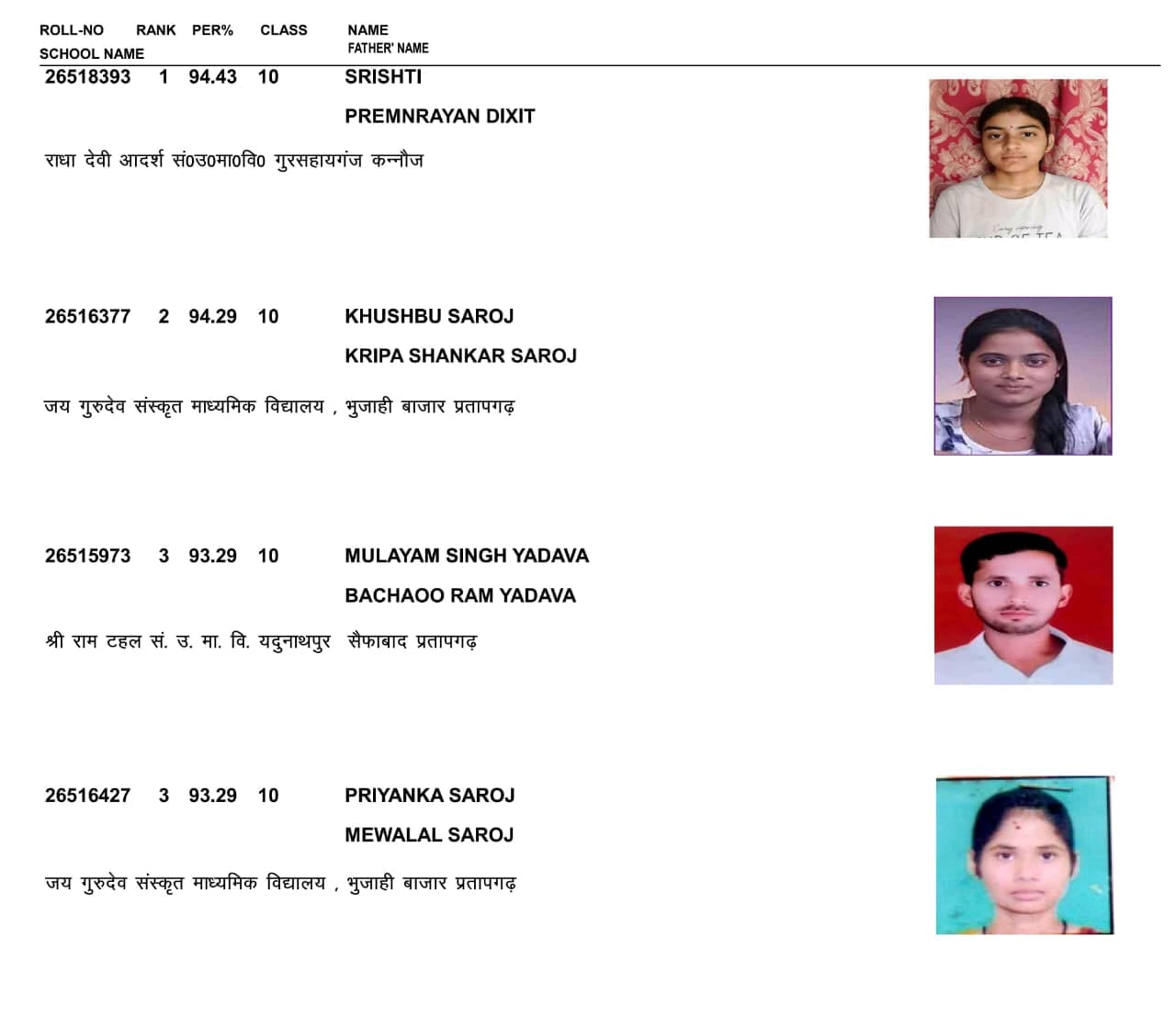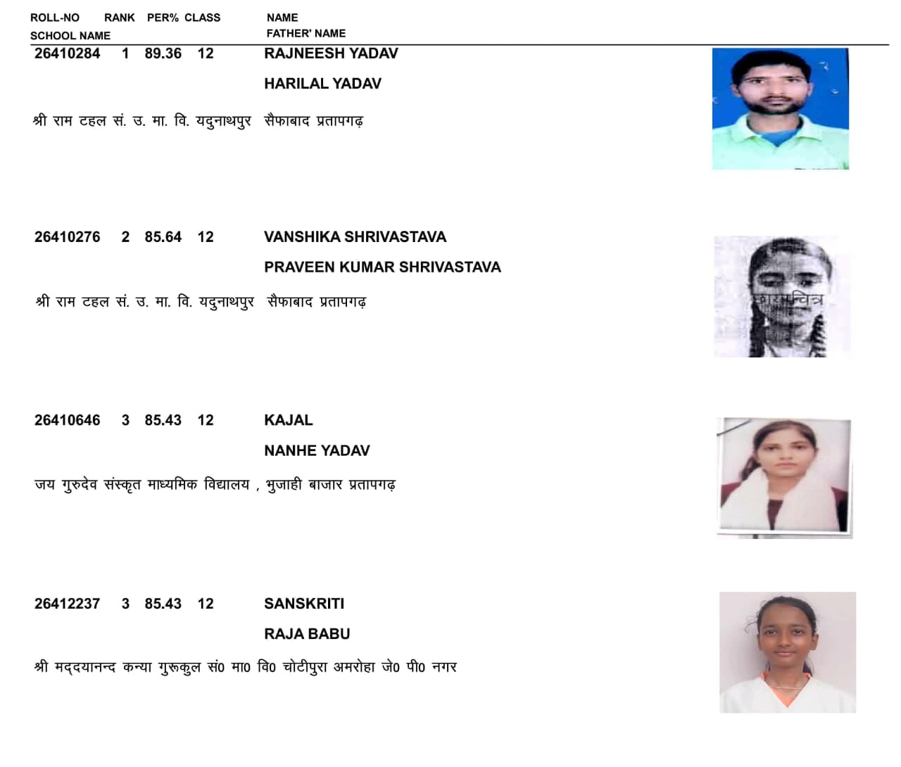 तीसरे स्थान पर प्रतापगढ़ के मुलायम सिंह और प्रियंका सरोज संयुक्त रूप से 93.29 प्रतिशत अंकों के साथ रहे। वहीं, उत्तर मध्यमा द्वितीय (कक्षा 12) में रजनीश यादव ने प्रदेश टॉप किया है। दूसरे नंबर पर वंशिका श्रीवास्तव हैं। तीसरे नंबर पर काजल और संस्कृति हैं। रजनीश, वंशिका और काजल प्रतापगढ़ के रहने वाले हैं। संस्कृति अमरोहा की रहने वाली हैं।