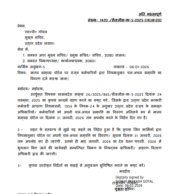 प्रदेश सरकार ने राज्य कर्मचारियों के लिए मानव संपदा पोर्टल पर संपत्ति विवरण देना अनिवार्य किया है। 31 जनवरी 2026 तक 31 दिसंबर 2025 तक अर्जित चल-अचल संपत्ति का ब्योरा न देने पर फरवरी का वेतन रोका जाएगा। आठ लाख से अधिक कर्मचारी प्रभावित होंगे।