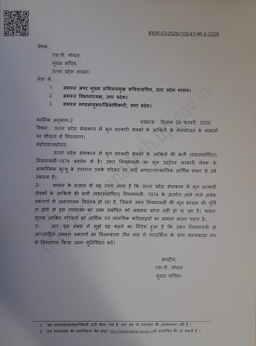उत्तर प्रदेश शासन ने मृत सरकारी कर्मचारियों के आश्रितों को नियमावली-1974 के तहत दी जाने वाली नौकरी के मामलों का निस्तारण अधिकतम तीन माह में करने के निर्देश दिए हैं। मुख्य सचिव एस.पी. गोयल ने सभी विभागों को पारदर्शिता और समयबद्ध कार्रवाई सुनिश्चित करने को कहा है, ताकि परिवारों को राहत मिल सके।
