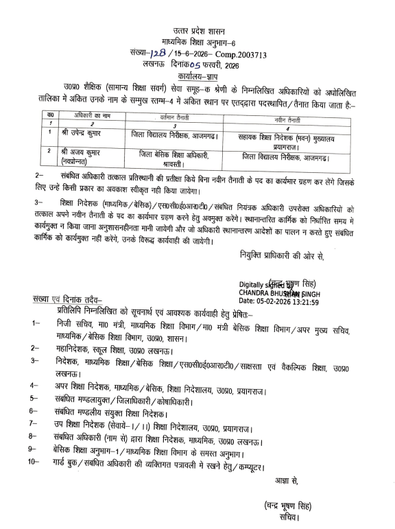 वहीं नवप्रोन्नत अधिकारी अजय कुमार को जिला बेसिक शिक्षा अधिकारी श्रावस्ती से जिला विद्यालय निरीक्षक आजमगढ़ के पद पर नियुक्त किया गया है। आदेश में स्पष्ट किया गया है कि संबंधित अधिकारी तत्काल बिना प्रतिस्थानी की प्रतीक्षा किए नवीन तैनाती स्थल पर कार्यभार ग्रहण करेंगे। समय पर कार्यमुक्त न करने पर अनुशासनात्मक कार्रवाई की चेतावनी दी गई है। पढ़िए लिस्ट..