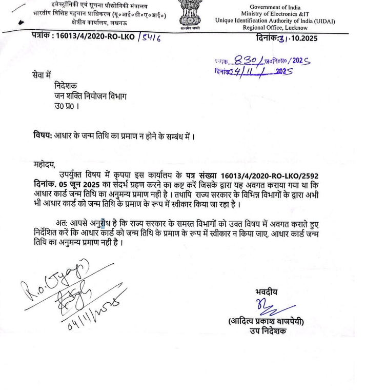 यूपी सरकार ने स्पष्ट कर दिया है कि अब आधार कार्ड को जन्म तिथि साबित करने के लिए मान्य दस्तावेज़ नहीं माना जाएगा, क्योंकि इसमें जन्म तिथि का प्रमाणित रिकॉर्ड नहीं होता।