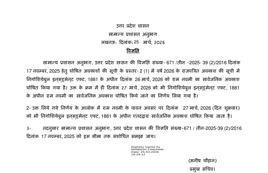 रामनवमी पर योगी सरकार ने बड़ा निर्णय लिया है। पहले से घोषित 26 मार्च के सार्वजनिक अवकाश के साथ अब 27 मार्च को भी छुट्टी घोषित कर दी गई है। मंदिरों में रामनवमी के दौरान श्रद्धालुओं की बढ़ती भीड़ को ध्यान में रखते हुए यह कदम उठाया गया है।