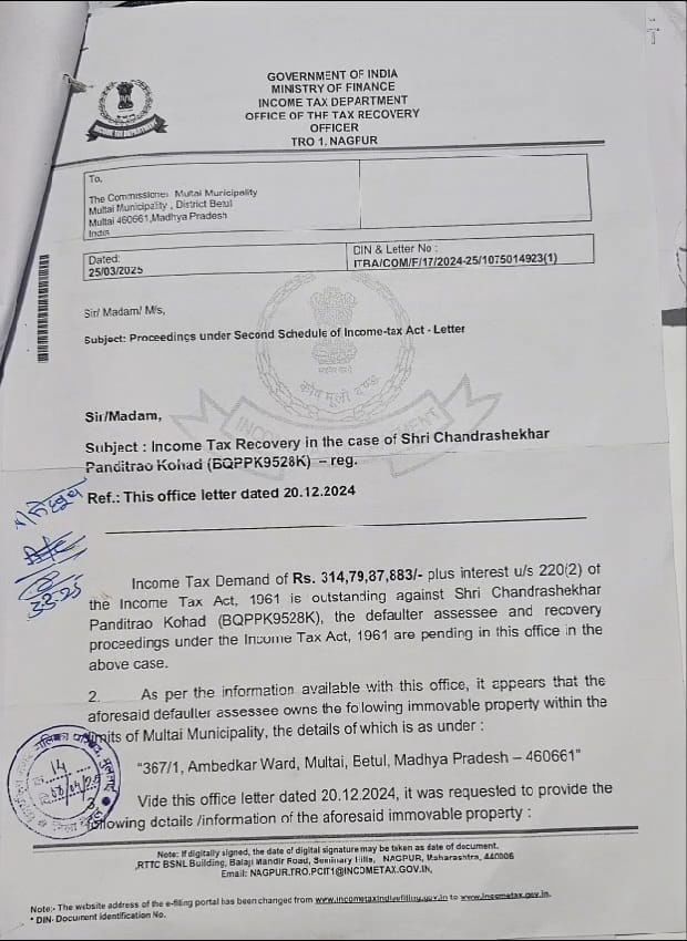 मध्यप्रदेश के बैतूल जिले से एक असामान्य मामला सामने आया है। यहां एक दिहाड़ी मजदूर के नाम पर 314 करोड़ रुपये से अधिक का टैक्स नोटिस जारी किया गया है। महाराष्ट्र के आयकर अधिकारियों ने मुलताई नगर पालिका से जिस व्यक्ति की संपत्ति जानकारी मांगी है, वह चंद्रशेखर पंडित राव कोहाड़ के नाम से थी। जांच में पता चला कि जमीन वास्तव में मनोहर हरकचंद नामक व्यक्ति के नाम दर्ज है। पालिका ने अपनी जांच रिपोर्ट आयकर विभाग को भेज दी।