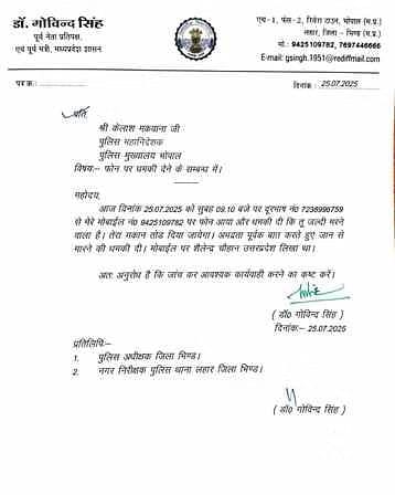 मध्यप्रदेश की राजनीति एक बार फिर उस समय गरमा गई जब वरिष्ठ कांग्रेस नेता और पूर्व नेता प्रतिपक्ष डॉ. गोविंद सिंह को जान से मारने की धमकी मिली। यह धमकी 25 जुलाई को एक अज्ञात व्यक्ति द्वारा मोबाइल फोन पर दी गई, जिसमें उनके मकान को तोड़ने और उनकी जान लेने की बात कही गई। इस गंभीर प्रकरण को लेकर डॉ. सिंह ने राज्य के पुलिस महानिदेशक कैलाश मकवाना को पत्र लिखकर सुरक्षा बढ़ाने और तत्काल जांच कर कार्रवाई की मांग की है।