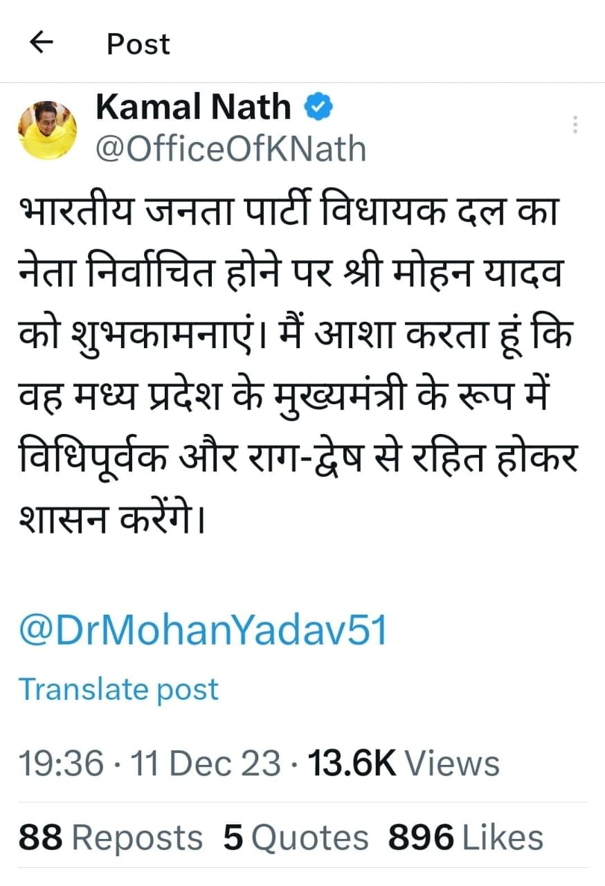 कांग्रेस के प्रदेश अध्यक्ष कमलनाथ ने ट्वीट कर बधाई देते हुए लिखा, 'भारतीय जनता पार्टी विधायक दल का नेता निर्वाचित होने पर श्री मोहन यादव को शुभकामनाएं। मैं आशा करता हूं कि वह मध्य प्रदेश के मुख्यमंत्री के रूप में विधिपूर्वक और राग-द्वेष से रहित होकर शासन करेंगे।'