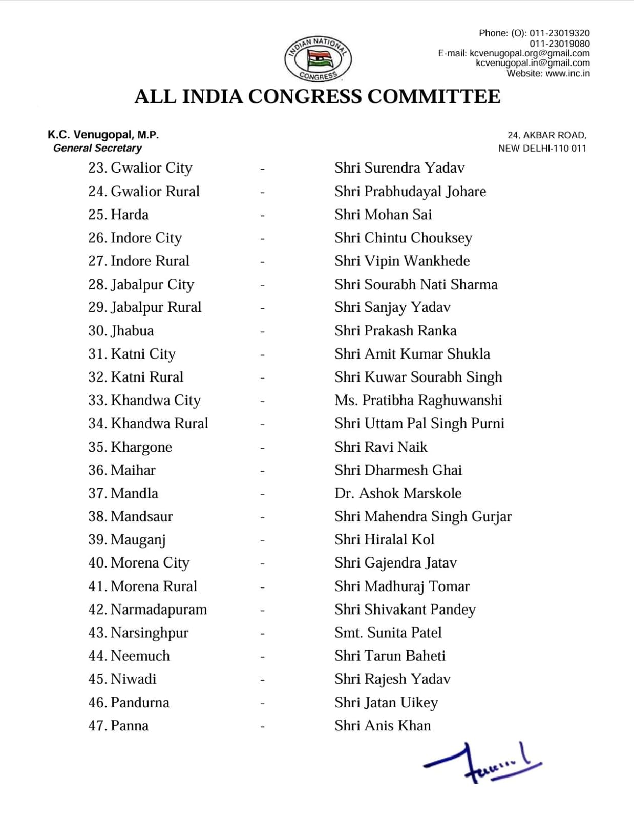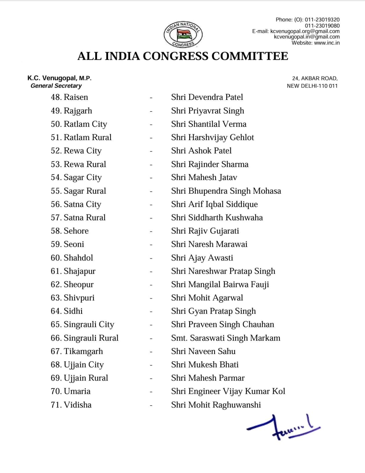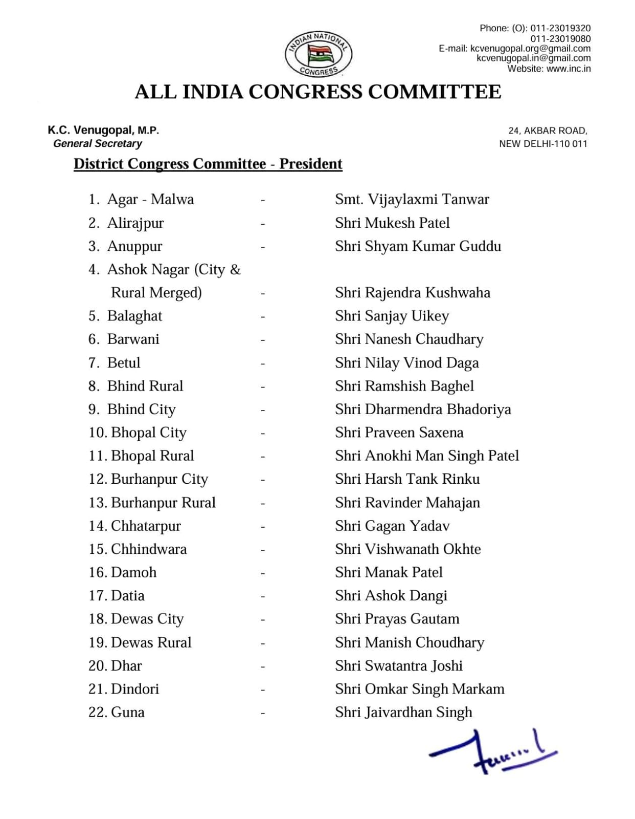 मध्य प्रदेश कांग्रेस से बहुप्रतीक्षित जिला में शहर और ग्रामीण अध्यक्षों की घोषणा कर दी। ऑल इंडिया कांग्रेस की तरफ से जारी सूची में 71 शहर और ग्रामीण अध्यक्षों के नाम शामिल है। गुना में दिग्विजय सिंह के बेटे और विधायक जयवर्धन सिंह और उनके भतीजे प्रियव्रत सिंह को राजगढ़ का अध्यक्ष बनाया गया है। वहीं, डिंडौरी से ओमकार मरकाम को अध्यक्ष बनाया गया है।