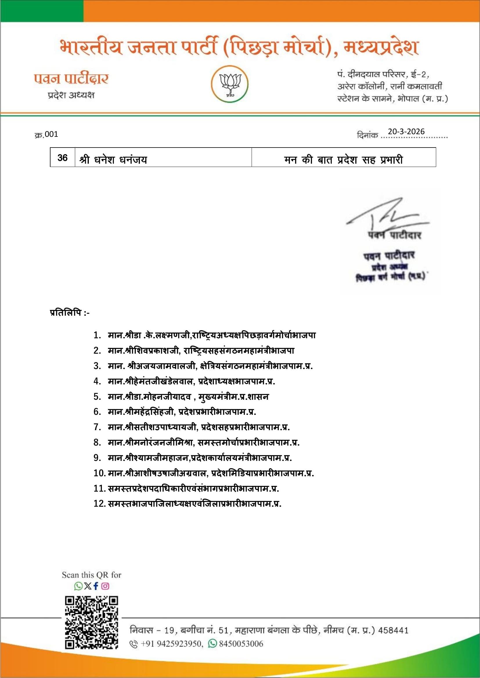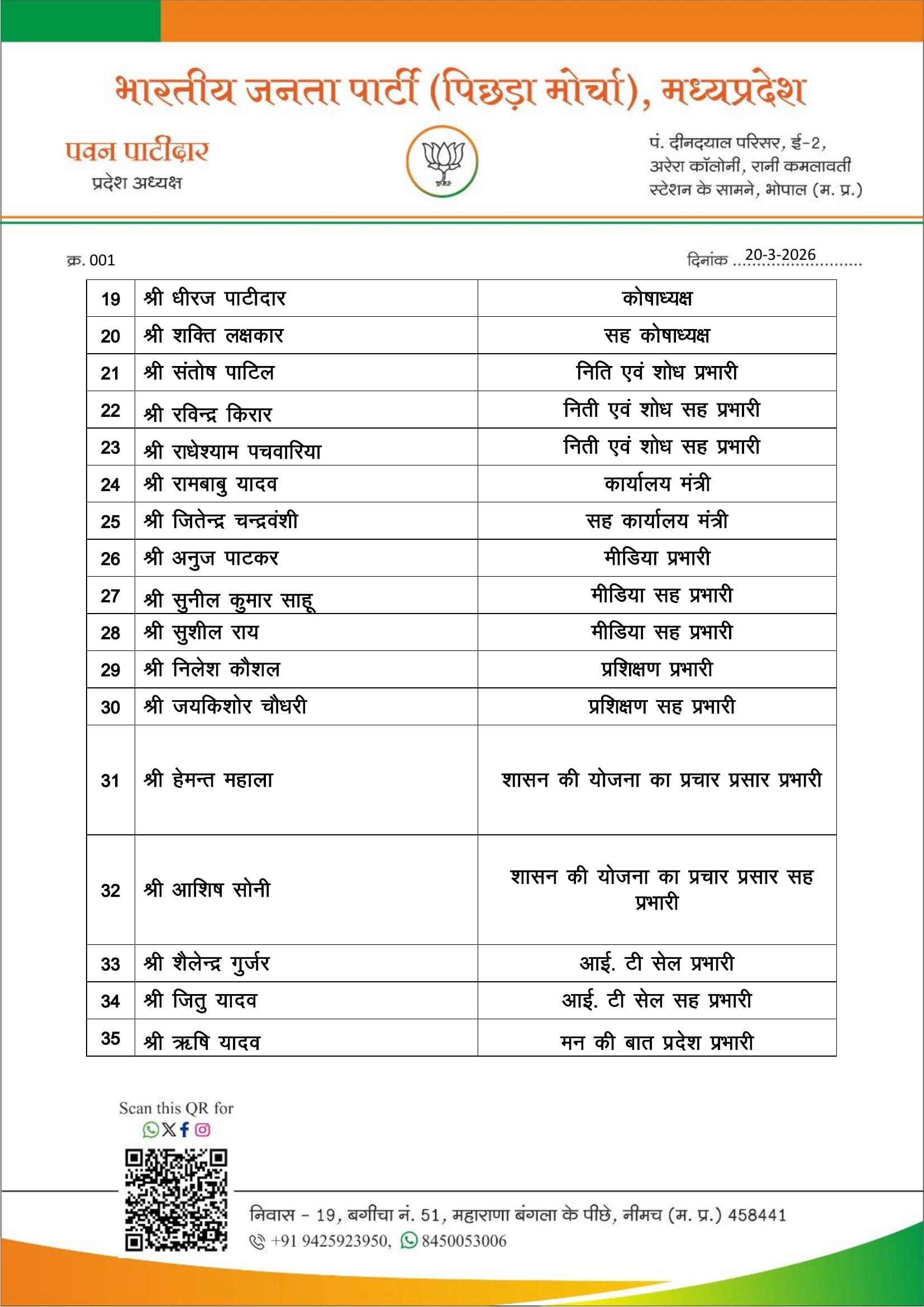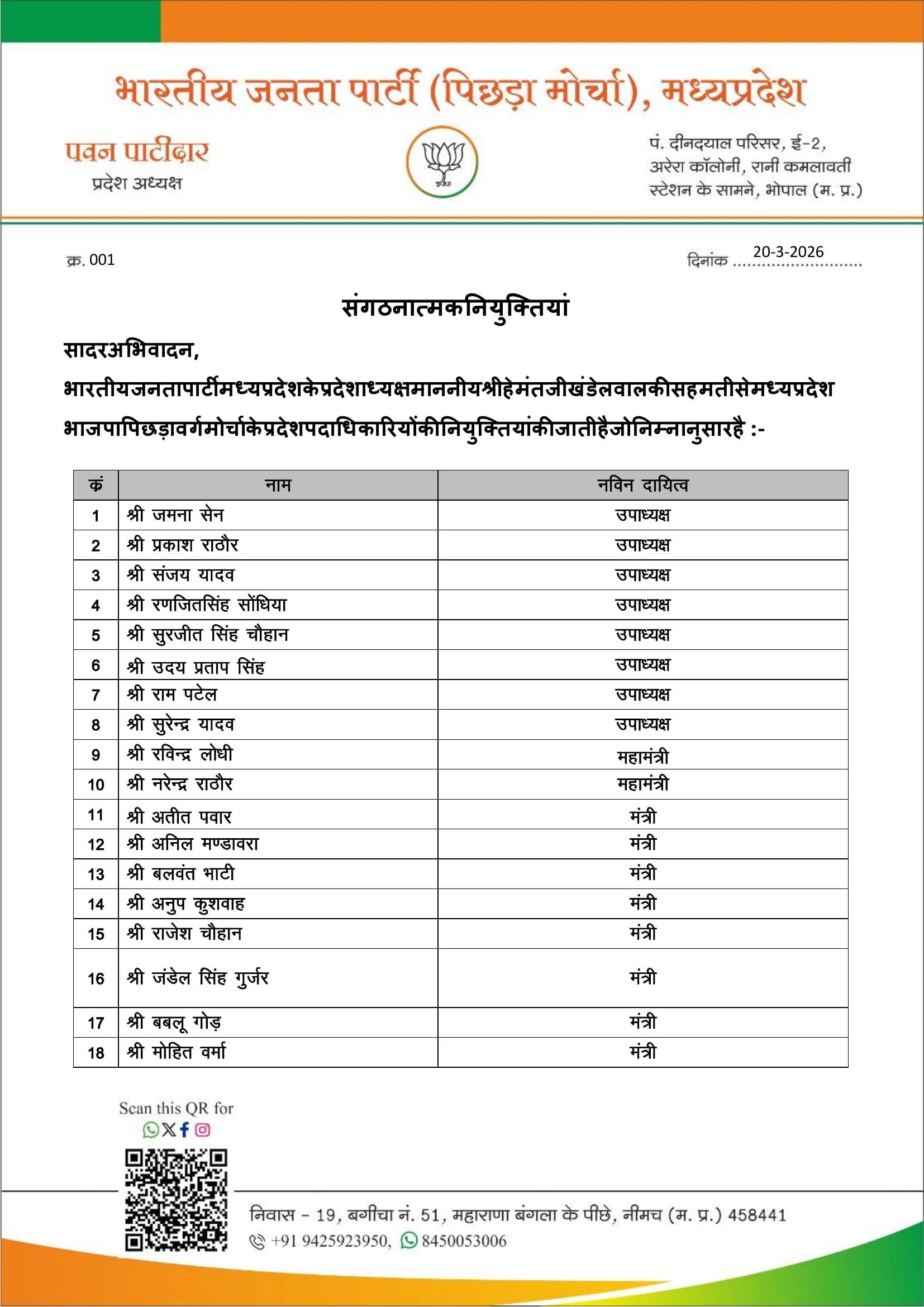 प्रदेश अध्यक्ष पवन पाटीदार ने भी प्रदेश अध्यक्ष हेमंत खंडेलवाल की सहमति से पदाधिकारियों की नियुक्ति की है। पिछड़े वर्ग के हितों की रक्षा, सरकारी योजनाओं के प्रचार-प्रसार तथा समुदाय की आवाज को मजबूत करने पर विशेष ध्यान रहेगा। इसमें आठ उपाध्यक्ष, दो महामंत्री, आठ मंत्री, एक कोषाध्यक्ष, सह-कोषाध्यक्ष, मीडिया प्रभारी, कार्यालय मंत्री, सोशल मीडिया प्रभारी, प्रशिक्षण प्रभारी, आईटी सेल प्रभारी शासन की योजनाओं का प्रचार-प्रसार प्रभारी और