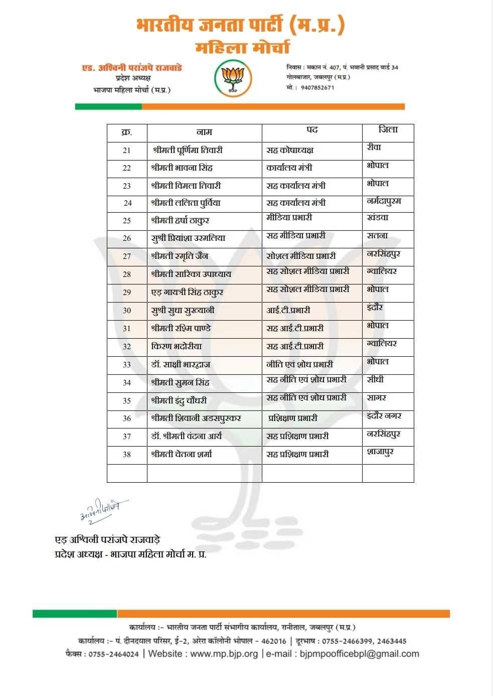 प्रदेश अध्यक्ष अश्विनी परांजपे ने प्रदेश अध्यक्ष हेमंत खंडेलवाल की सहमति से नई टीम का गठन किया है। यह टीम महिला सशक्तिकरण, जमीनी स्तर पर कार्य तथा पार्टी की योजनाओं के प्रचार में अहम भूमिका निभाएगी। इसमें सात उपाध्यक्ष, तीन महामंत्री, आठ महामंत्री, एक कोषाध्यक्ष, दो सह-कोषाध्यक्ष, एक कार्यालय मंत्री, दो सह कार्यालय मंत्री, मीडिया प्रभारी, सोशल मीडिया प्रभारी, आईटी प्रभारी, नीति एवं शोध प्रभारी और प्रशिक्षण प्रभारी शामिल हैं।