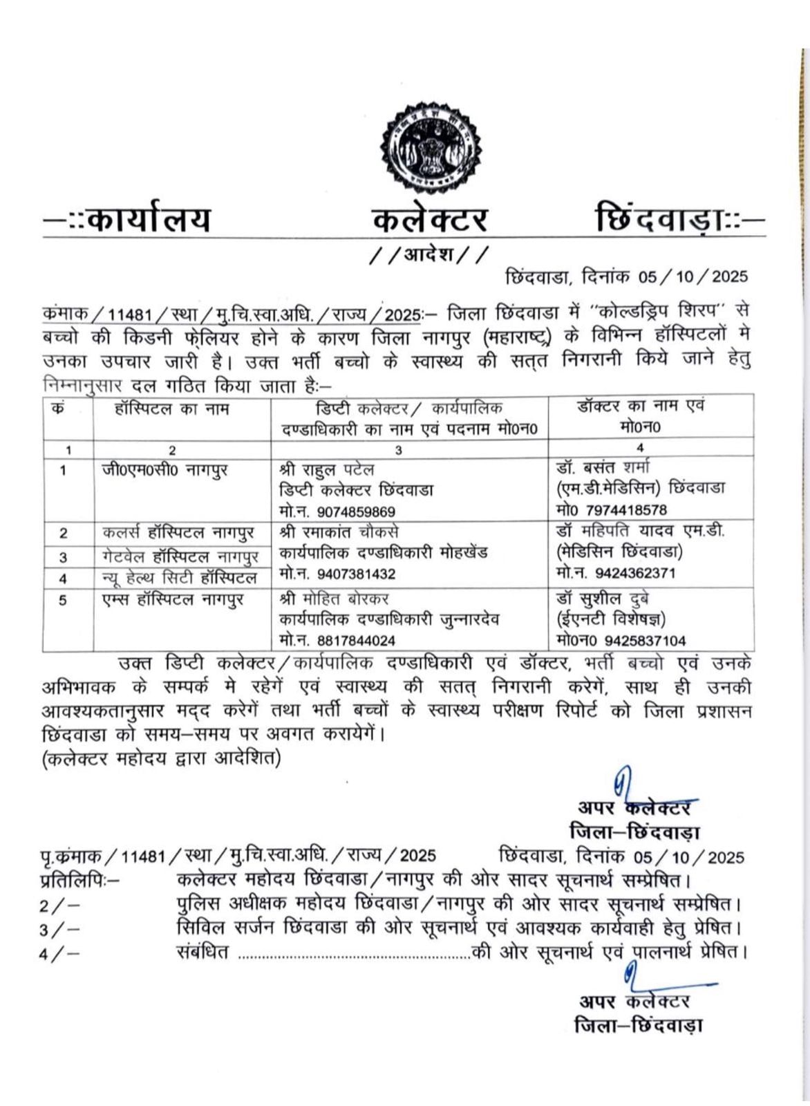 मध्य प्रदेश में दूषित कोल्ड्रिफ सिरप के कारण किडनी संक्रमण से ग्रस्त कुल 9 बच्चे नागपुर के विभिन्न अस्पतालों में भर्ती हैं। इनमें छिंदवाड़ा के 7 और बैतूल के 2 बच्चे शामिल हैं। सभी बच्चों का इलाज जारी है। मुख्यमंत्री डॉ. मोहन यादव ने सभी बच्चों के उपचार का पूरा खर्च राज्य सरकार द्वारा वहन करने के निर्देश दिए हैं।