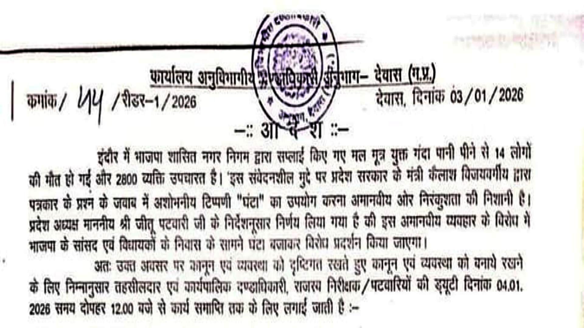 दरअसल 3 जनवरी 2026 को देवास एसडीएम कार्यालय से आदेश क्रमांक 44/रीडर-1/2026 जारी किया गया था। यह आदेश कांग्रेस द्वारा प्रस्तावित प्रदर्शन के दौरान कानून-व्यवस्था बनाए रखने हेतु अधिकारियों की ड्यूटी लगाने से संबंधित था। हालांकि, आदेश की भाषा ने सभी को चौंका दिया। एसडीएम आनंद मालवीय द्वारा हस्ताक्षरित आदेश में लिखा गया कि इंदौर में भाजपा शासित नगर निगम द्वारा सप्लाई किए गए कथित गंदे पानी से 14 लोगों की मौत हुई है और 2800 लोग उपचाररत हैं। साथ ही, मंत्री कैलाश विजयवर्गीय द्वारा पत्रकार के प्रश्न के उत्तर में दिए गए शब्द ‘घंटा’ को अमानवीय और निरंकुश बताया गया। आदेश में यह भी उल्लेख किया गया कि कांग्रेस प्रदेश अध्यक्ष जीतू पटवारी के निर्देश पर भाजपा सांसदों और विधायकों के घरों के सामने ‘घंटा’ बजाकर विरोध प्रदर्शन किया जाएगा।