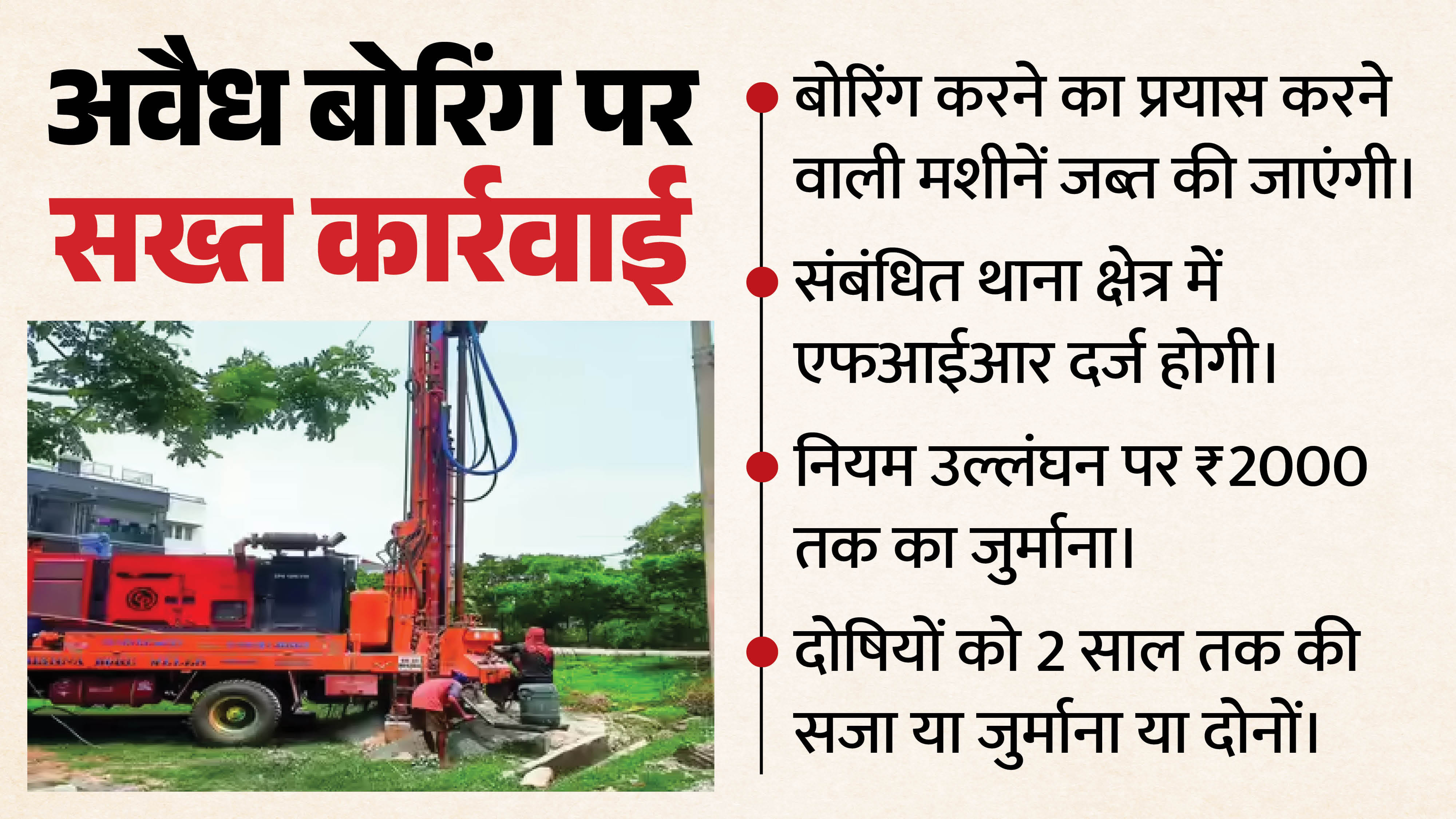 ऐसी बोरिंग मशीनें जो प्रतिबंध के बावजूद जिले में प्रवेश करेंगी या बोरिंग करने का प्रयास करेंगी, उन्हें जब्त किया जाएगा और संबंधित थाना क्षेत्र में एफआईआर दर्ज की जाएगी। प्रतिबंध का उल्लंघन करने पर 2 हजार रुपये का जुर्माना और दो साल तक की सजा या दोनों का प्रावधान है। यह आदेश सरकारी योजनाओं के तहत होने वाले नलकूप उत्खनन पर लागू नहीं होगा। यदि जल संकट और बढ़ता है, तो प्रशासन धारा-4 के तहत निजी बोरिंग का अधिग्रहण भी कर सकता है।