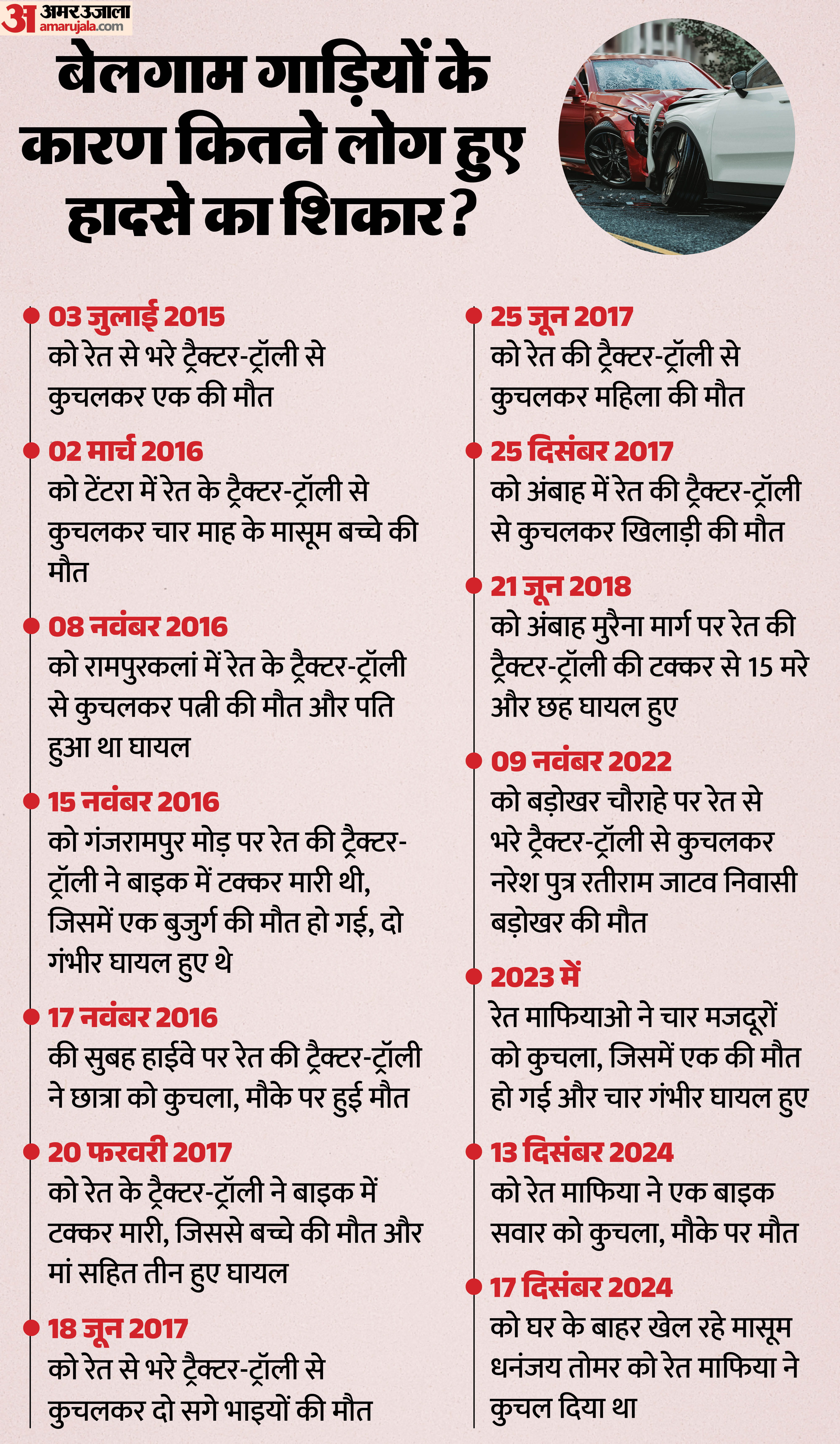 • 20 फरवरी 2017 को रेत के ट्रैक्टर-ट्रॉली ने बाइक में टक्कर मारी, जिससे बच्चे की मौत और मां सहित तीन हुए घायल