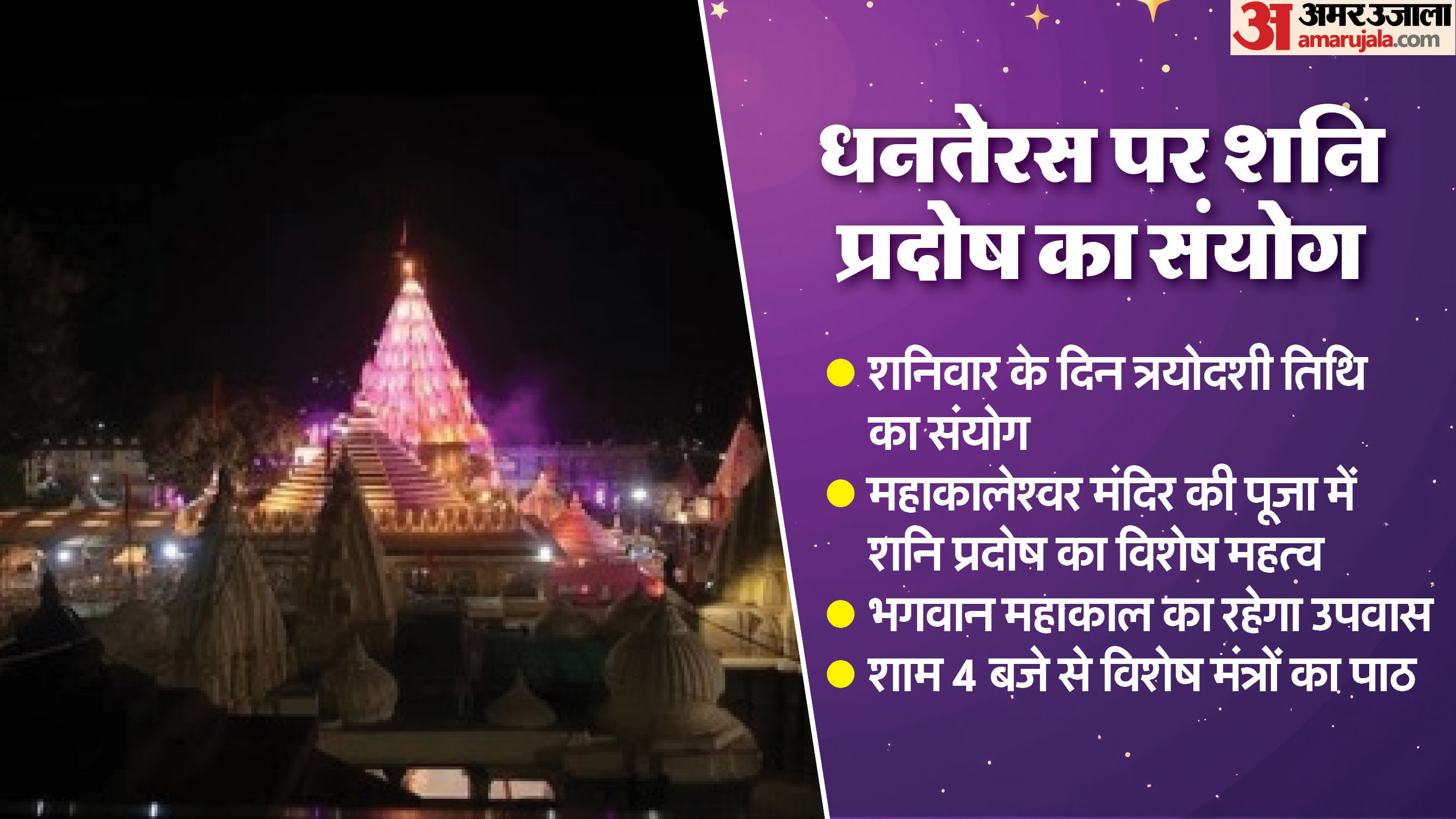 महाकालेश्वर मंदिर के पुजारी पं. महेश शर्मा ने बताया कि महाकाल मंदिर में इस वर्ष दीपपर्व की शुरुआत शनि प्रदोष के संयोग में आई धनतेरस से हो रहा है। शनिवार के दिन त्रयोदशी तिथि होने से शनि प्रदोष का संयोग बनता है। महाकालेश्वर मंदिर की पूजन परंपरा में शनि प्रदोष का विशेष महत्व है। इस दिन भगवान महाकाल उपवास रखते हैं तथा शाम को 4 बजे विशेष मंत्र व पाठ से उनका अभिषेक पूजन किया जाता है।