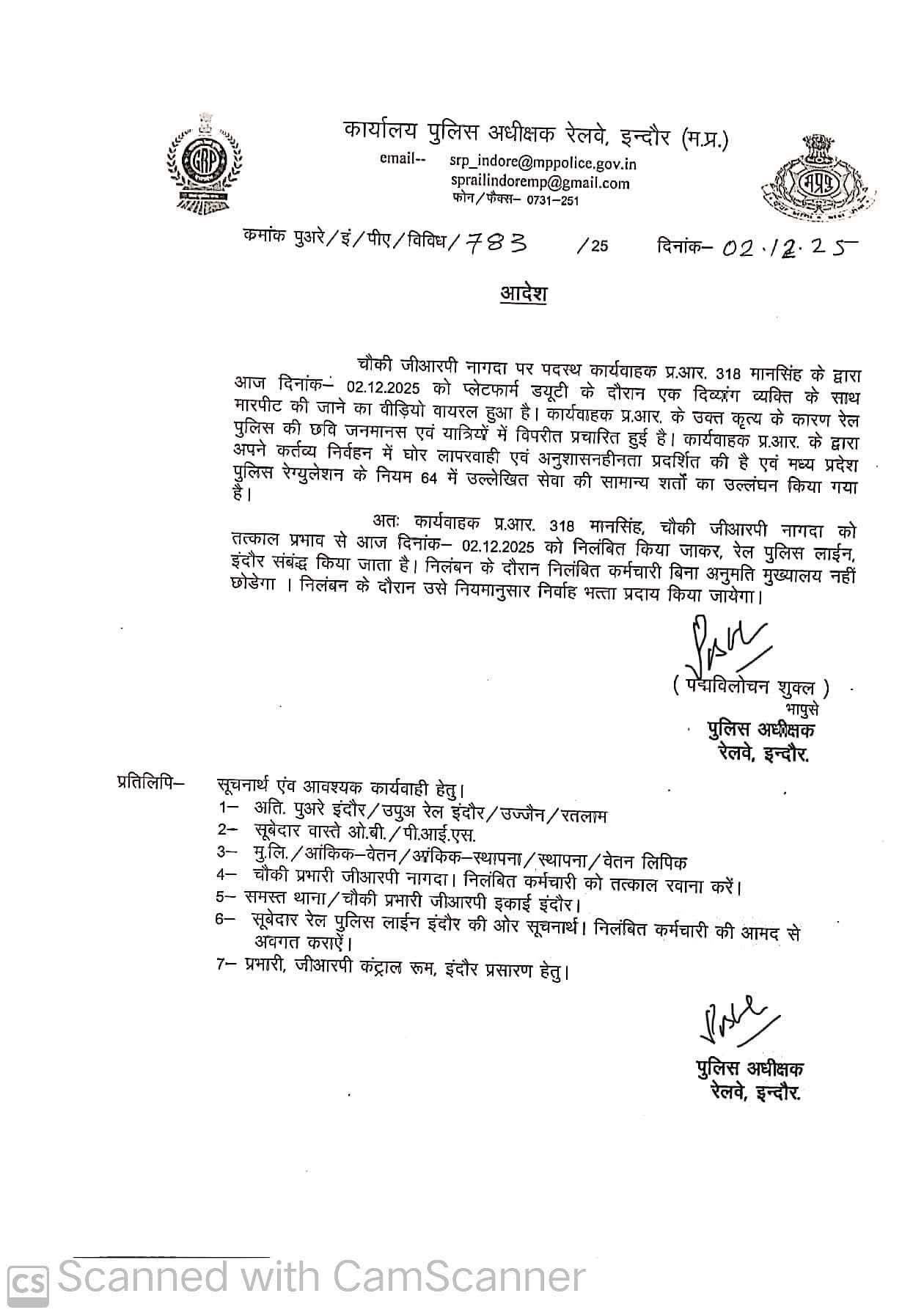 नागदा रेलवे स्टेशन पर दिव्यांग व्यक्ति से मारपीट के वायरल वीडियो के बाद जीआरपी ने तत्काल कार्रवाई करते हुए प्रधान आरक्षक मानसिंह को निलंबित कर दिया है। पढ़ें पूरी खबर