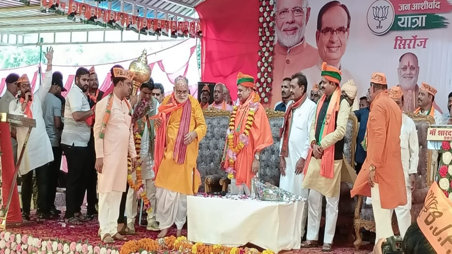 मध्यप्रदेश में इन दिनों बीजेपी द्वारा जन आशीर्वाद यात्रा प्रदेश भर में निकाली जा रही है। रविवार को जन आशीर्वाद यात्रा गुना जिले से होते हुए विदिशा की लटेरी में प्रवेश हुई। इस दौरान सोमवार को सिरोंज में जन आशीर्वाद यात्रा पहुंची, जिसमें असम के मुख्यमंत्री हिमंत बिस्वा सरमा जनसभा को संबोधित करने पहुंचे थे। इस दौरान कांग्रेस कार्यकर्ताओं ने जन आशीर्वाद यात्रा के काफिले को काले झंडे दिखाए।