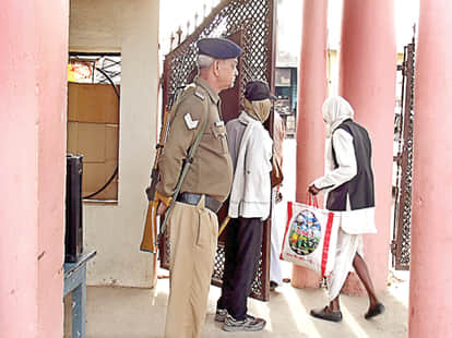 जानकीकुंड अस्पताल गेट पर सुरक्षाकर्मी की मौजूदगी में अंदर बाहर जाते मरीज व तीमारदार।