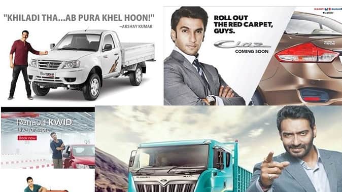 जो दिखता है वही बिकता है। इस बात को ऑटो कंपनियां पूरी तरह से सार्थक करने पर जुटी हुई हैं। देश की लगभग सभी बड़ी ऑटो कंपनियां अपने लोकप्रिय उत्पादों को बेचने के लिए बड़े बॉलीवुड स्टार्स का सहारा ले रही हैं। शाहरुख खान सालों तक टीवी पर हुंडई की कारों का प्रचार करते नजर आए तो वहीं सलमान खान ने दबंग हिट होने के बाद सुजुकी हयाते मोटरसाइकिल का प्रचार किया। इन सितारों के सहारे कंपनियों ने उन बुलंदियों को भी छुआ जिसकी वो उम्मीद कर रही थीं। तो आइए आज आपको ऐसे बॉलीवुड सितारों से मिलवाते हैं जिन्होंने ऑटो कंपनियों की बिक्री को बढ़ाने के लिए उनके ब्रांड अंबेस्डर बन गए।