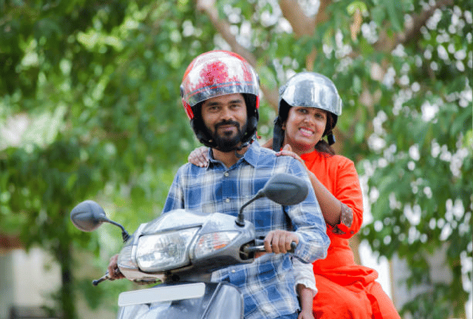 बिना हेलमेट के दोपहिया वाहन का उपयोग करते लोग