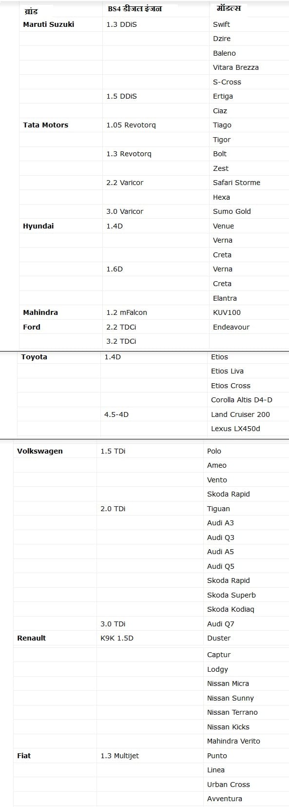 वहीं मारुति सुजुकी पहले ही अपनी कारों के डीजल वेरियंट को बंद करने का एलान कर चुकी है। मारुति ने अपनी दो केवल डीजल वेरियंट में ही आने वाली कारों मारुति विटारा ब्रेजा और एस-क्रॉस को बीएस6 पेट्रोल इंजन के साथ उतारा है। वहीं रेनो ने भी अपनी कारों में डीजल इंजन देना बंद कर दिया है। इसके अलावा ह्यूंदै ने अपने ज्यादातर बीएस4 कारों को बीएस6 में अपग्रेड कर दिया है। वहीं कैब ड्राइवर्स और फ्लीट सेगमेंट की Xcent प्राइम डीजल को कंपनी ने बंद कर दिया है। हाल ही में ह्यूंदै ने फ्लीट सेगमेंटे के लिए Xcent को सीएनजी वेरियंट के साथ उतारा है।