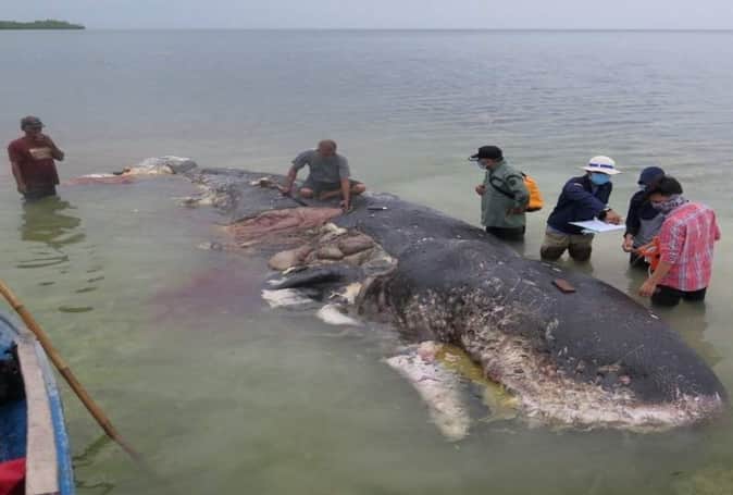 वाकाटोबी नेशनल पार्क के प्रमुख हेरी सैंटोसो ने बताया कि 31 फीट यह जीव मरने के बाद समुद्र में ही सड़ गया था और उसके शरीर को कीड़े-मकोड़े खा रहे थे। उन्होंने बताया कि व्हेल के पेट से करीब 6 किलो वजन का प्लास्टिक कचरा मिला है।