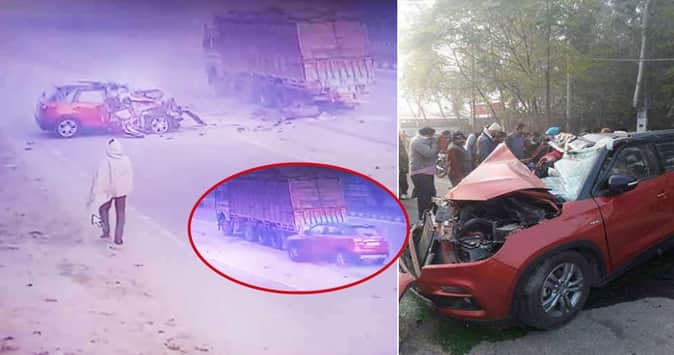 CCTV: बीच सड़क खड़े ट्रक से टकराई ब्रेजा कार, यूं खुशियां बदल गईं मातम में