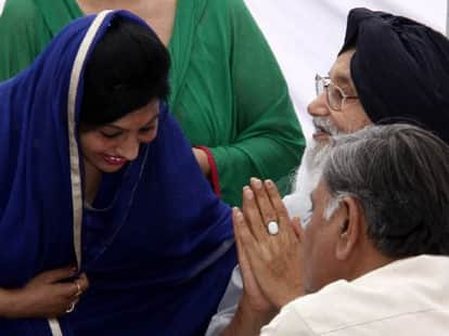 पंजाब कैबिनेट में तीन नए मंत्री शामिल किए गए हैं। पद की गोपनीयता की शपथ लेने के बाद पति को मंत्री बनाने के लिए मुख्यमंत्री प्रकाश सिंह बादल का धन्यवाद करती दलजीत सिंह चीमा की पत्नी।