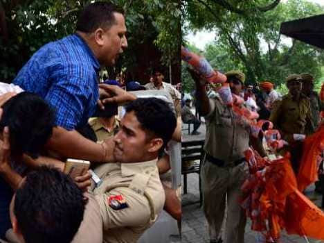 एबीवीपी छात्र संगठन के कार्यकर्ता को पकड़ कर ले जाती हुई पीयू की सिक्योरिटी पुलिस।