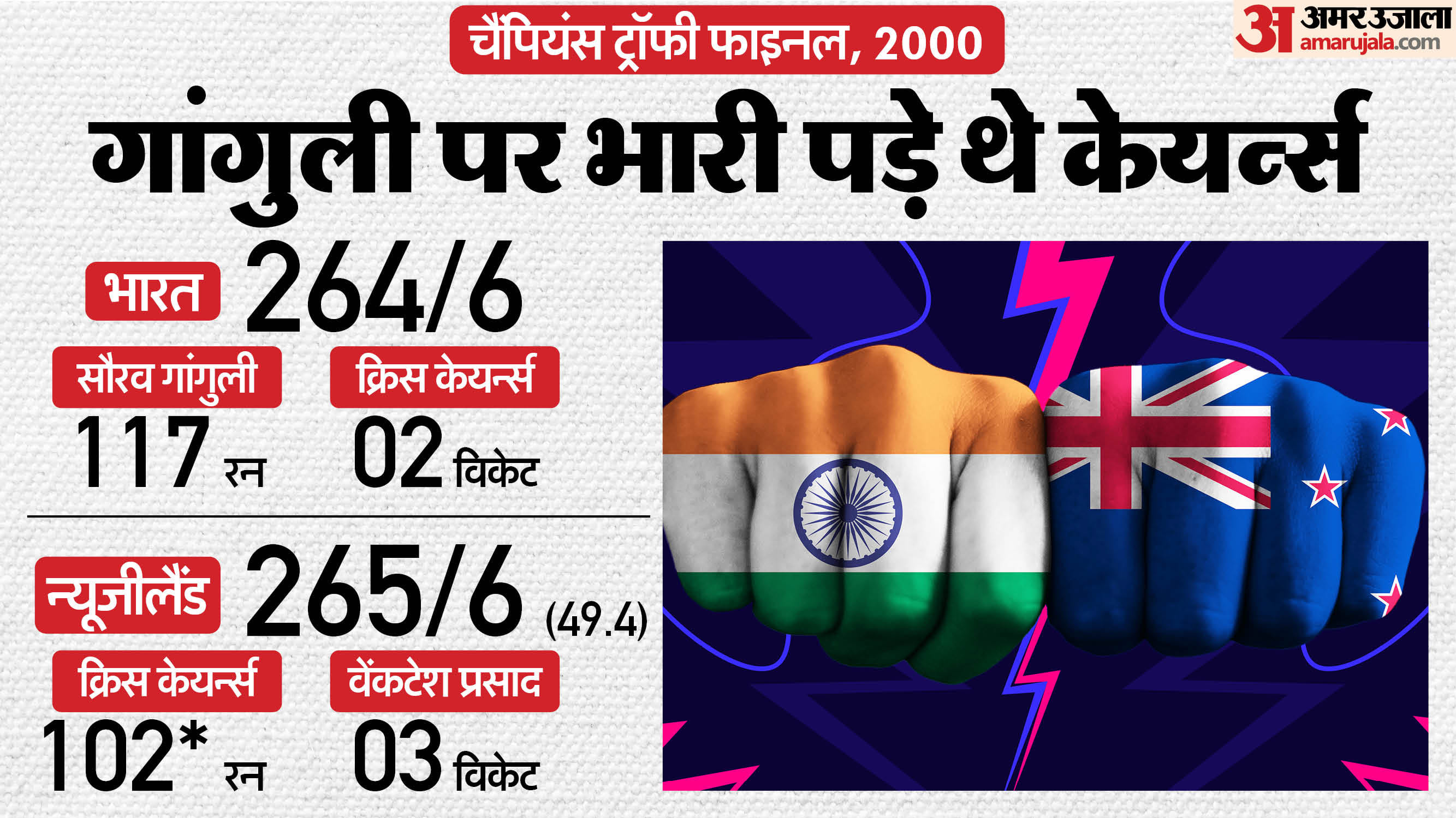 भारत और न्यूजीलैंड किसी आईसीसी टूर्नामेंट के नॉकआउट में पहली बार साल 2000 के चैंपियंस ट्रॉफी फाइनल में आमने-सामने आए थे। तब स्टीफन फ्लेमिंग की अगुआई वाली न्यूजीलैंड टीम ने सौरव गांगुली की अगुआई वाली भारतीय टीम चार विकेट से हराया था। भारत ने पहले बल्लेबाजी करते हुए 50 ओवर में छह विकेट पर 264 रन बनाए थे। गांगुली ने 117 रन और सचिन ने 69 रन की पारी खेली थी। जवाब में न्यूजीलैंड ने 49.4 ओवर में छह विकेट गंवाकर लक्ष्य हासिल कर लिया था। क्रिस केयर्न्स उस मैच में प्लेयर ऑफ द मैच रहे थे। उन्होंने दो विकेट लेने के अलावा 102 रन की नाबाद पारी खेली थी। इसके अलावा क्रिस हैरिस ने 46 और नाथन एस्टल ने 37 रन बनाए थे।