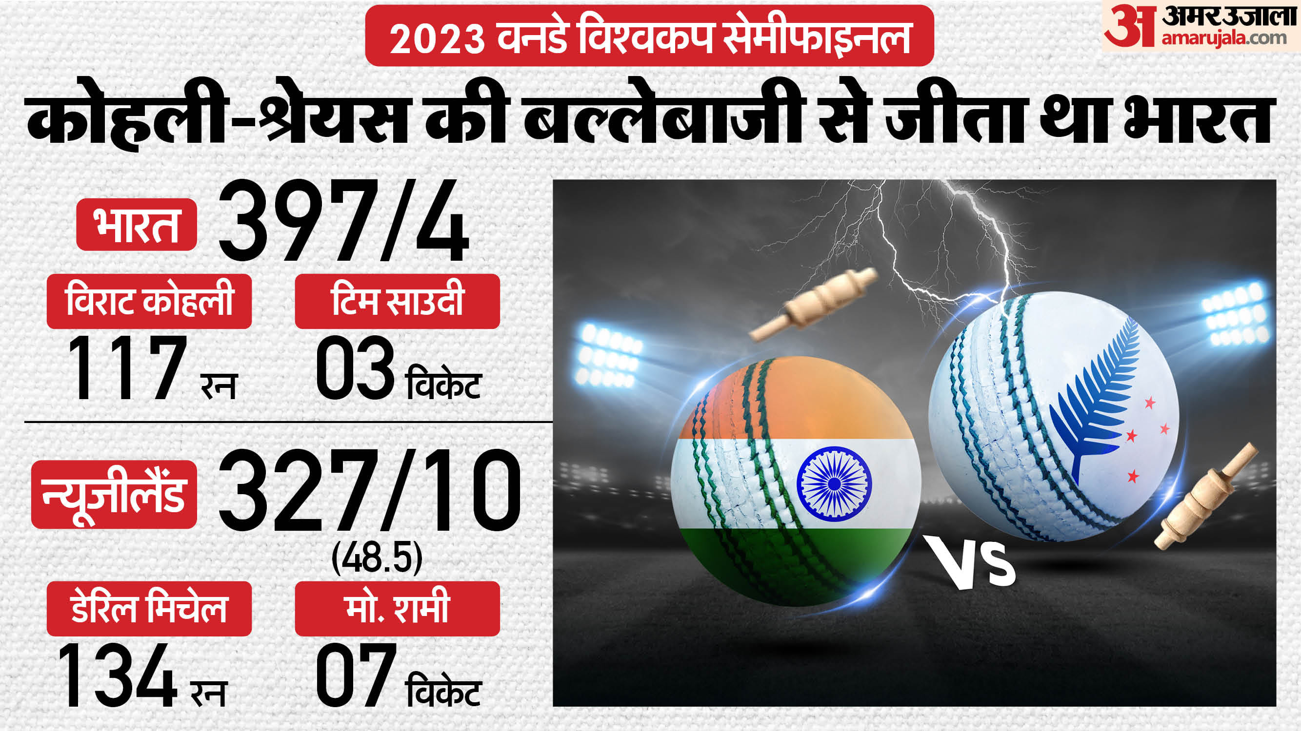 2021 के बाद भारत और न्यूजीलैंड की टीमें 2023 वनडे विश्वकप के सेमीफाइनल में आमने-सामने आईं। रोहित की अगुआई में टीम इंडिया ने विलियम्सन की अगुआई वाली न्यूजीलैंड टीम को 70 रन से हराया था। वानखेड़े में खेले गए इस मुकाबले में भारत ने पहले बल्लेबाजी करते हुए 50 ओवर में चार विकेट पर 397 रन बनाए। रोहित ने 40 रन, शुभमन ने 80 रन, कोहली ने 117 रन और श्रेयस ने 105 रन की पारी खेली। न्यूजीलैंड की ओर से साउदी ने तीन विकेट लिए। जवाब में न्यूजीलैंड की टीम 48.5 ओवर में 327 रन पर ऑलआउट हो गई। डेरिल मिचेल ने 134 रन और ग्लेन फिलिप्स ने 41 रन की पारी खेली। विलियम्सन ने 69 रन बनाए। भारत की ओर से शमी ने सात विकेट झटके।