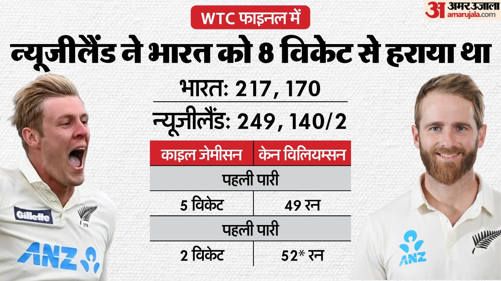 2019 के बाद भारत और न्यूजीलैंड 2021 में विश्व टेस्ट चैंपियनशिप के फाइनल में आमने-सामने आए। यह टेस्ट चैंपियनशिप का पहला फाइनल था। कोहली की अगुआई में भारतीय टीम मजबूत दिख रही थी। वहीं, न्यूजीलैंड की कमान केन विलियम्सन संभाल रहे थे। बारिश ने भी खलल डाला और रिजर्व डे में नतीजा आया। हालांकि, इस मैच में भारत की बल्लेबाजी खराब रही। भारत ने पहली पारी में 217 रन बनाए। कोहली 44 रन और रहाणे 49 रन बनाकर टॉप स्कोरर रहे। जेमीसन ने पांच विकेट झटके। जवाब में न्यूजीलैंड ने अपनी पहली पारी में 249 रन बनाए और भारत पर 32 रन की बढ़त हासिल की। डेवोन कॉनवे ने 54 रन और कप्तान विलियम्सन ने 49 रन की पारी खेली। टॉम लाथम और टिम साउदी ने 30-30 रन बनाए। भारत की ओर से शमी को चार विकेट मिले।
