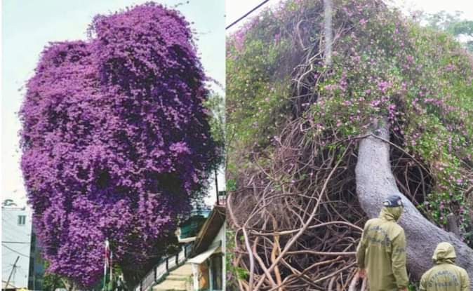 आज सुबह भारी के दौरान यह बोगनवेलिया और देवदार का पेड़ धराशायी हो गया। बताते हैं कि इन दोनों पेड़ों को करीब दो सौ साल के भी ज्यादा समय पहले एक साथ रोपा गया था।