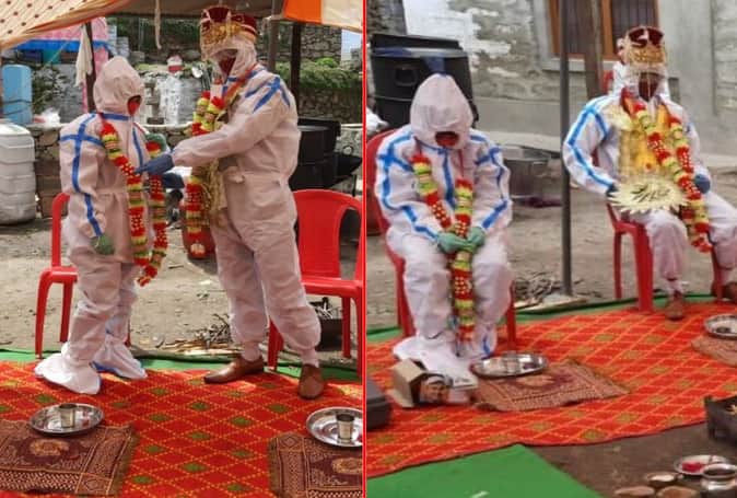 उत्तराखंड: शादी के दिन दुल्हन को हुआ कोरोना, पीपीई किट पहन एक-दूजे के हुए भूपेंद्र-विनीता, तस्वीरें...