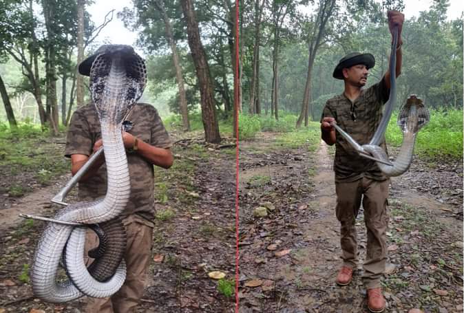 विशालकाय कोबरा का रेस्क्यू करते वन विभाग के कर्मचारी