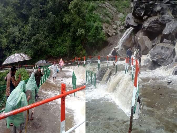 बीते रविवार को हुई मूसलाधार बारिश के बाद से पैदल मार्ग पर भीमबली में बरसाती झरने का प्रवाह बढ़ गया है। यहां पर पहाड़ी से पानी का सैलाब रास्ते में बह रहा है। यहां पर डीडीएमए द्वारा रास्ते के किनारे रैलिंग लगाई गई है।
