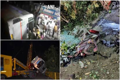 फ्लाईओवर से गिरी बस को क्रेन से उठाया गया