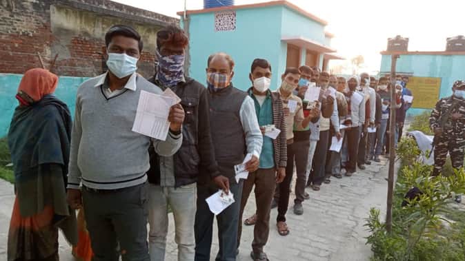 सीतापुर में शहर के चौधरी टोला सेकेंड में लाइन में खड़े मतदाता।