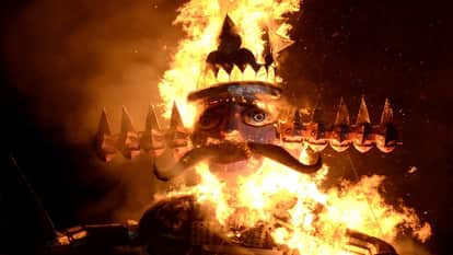 Dussehra 2022 Ravanas effigy burnt at Ramlila Maidan actors Prabhas and Kejriwal fired arrows