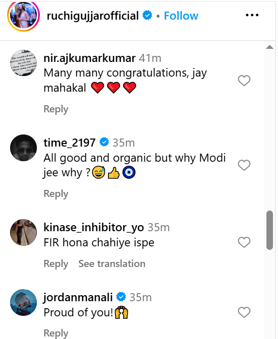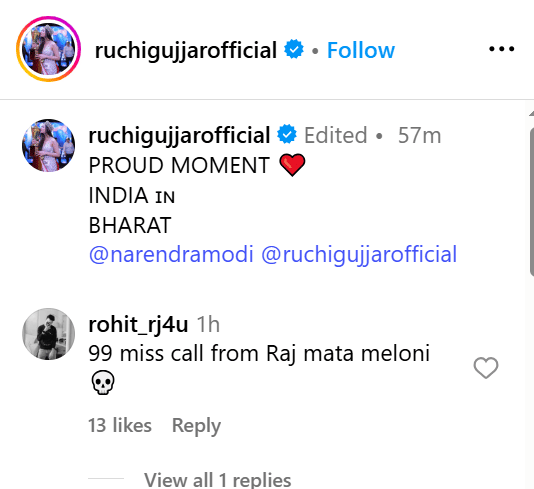 रुचि के पोस्ट पर यूजर्स के कमेंट आ रहे हैं। एक यूजर ने लिखा, 'आपके सिर पर हरियाणवी दुपट्टा बहुत जंच रहा है'। एक यूजर ने लिखा, 'बाकी सब ठीक है, लेकिन पीएम की फोटो नेकलेस पर क्यों?' वहीं कुछ यूजर्स नाराजगी जता रहे हैं। एक यूजर ने लिखा, 'एफआईआर होनी चाहिए इनके ऊपर'। एक यूजर ने लिखा, 'मेलोनी आपको ढूंढ रही हैं'।