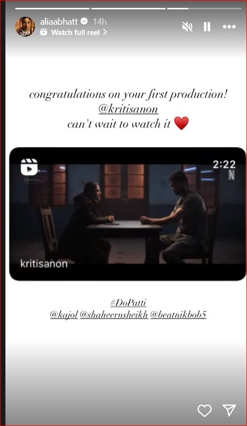 आलिया ने अपने इंस्टाग्राम स्टोरीज पर ट्रेलर साझा किया और लिखा, "आपके पहले प्रोडक्शन के लिए बधाई-कृति सेनन। इसे देखने के लिए अब और इंतजार नहीं कर सकती।" दो पत्ती इस साल की सबसे प्रतीक्षित रिलीज में से एक है। इस फिल्म में काजोल एक पुलिस अधिकारी की भूमिका निभाती नजर आएंगी, जबकि कृति इस फिल्म में डबल रोल में नजर आएंगी। शशांक चतुर्वेदी द्वारा निर्देशित, दो पत्ती को कृति और कनिका ढिल्लन द्वारा समर्थित किया गया है।