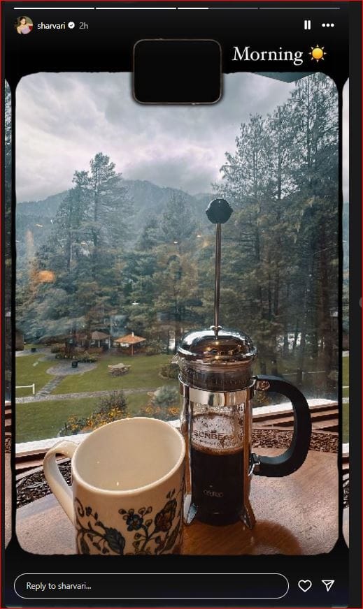 शरवरी वाघ ने जो कश्मीर से तस्वीर साझा की है की वह सुबह की है, इस तस्वीर से साफ पता चल रहा है कि शरवरी कश्मीर की खूबसूरती का लुत्फ उठा रही हैं। आज 30 अगस्त को कुछ ही देर पहले शरवरी ने अपने सोशल मीडिया अकाउंट इंस्टाग्राम पर एक मनमोहक तस्वीर साझा की। खिड़की से ली गई इस तस्वीर में पेड़ों से घिरे ऊंचे पहाड़ दिखाई दे रहे हैं, जिसमें शरवरी धरती के इस स्वर्ग में कॉफी का आनंद ले रही हैं। इस तस्वीर में एक फ्रेंच प्रेस कॉफी मेकर भी है, जिसके बगल में एक कप रखा हुआ है। उन्होंने शांत तस्वीर के साथ कैप्शन में लिखा है "सुबह", उसके बाद एक सन इमोजी।