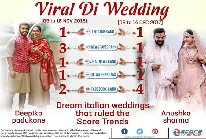 विरुष्का के बाद एक साल के अंदर ही दीपवीर की भी शादी हुई। ऐसे में अनुष्का शर्मा और विराट कोहली की शादी की लोकप्रियता की तुलना की जा रही है। इस बारे में बॉलीवुड की गलियारों में बात छिड़ी हुई है लेकिन स्कोर ट्रेंड्स इंडिया के आंकड़ों के अनुसार, यह बात साबित हुई हैं की, अनुष्का-विराट की ही शादी सबसे ज्यादा लोकप्रिय और वायरल शादी रही हैं।
