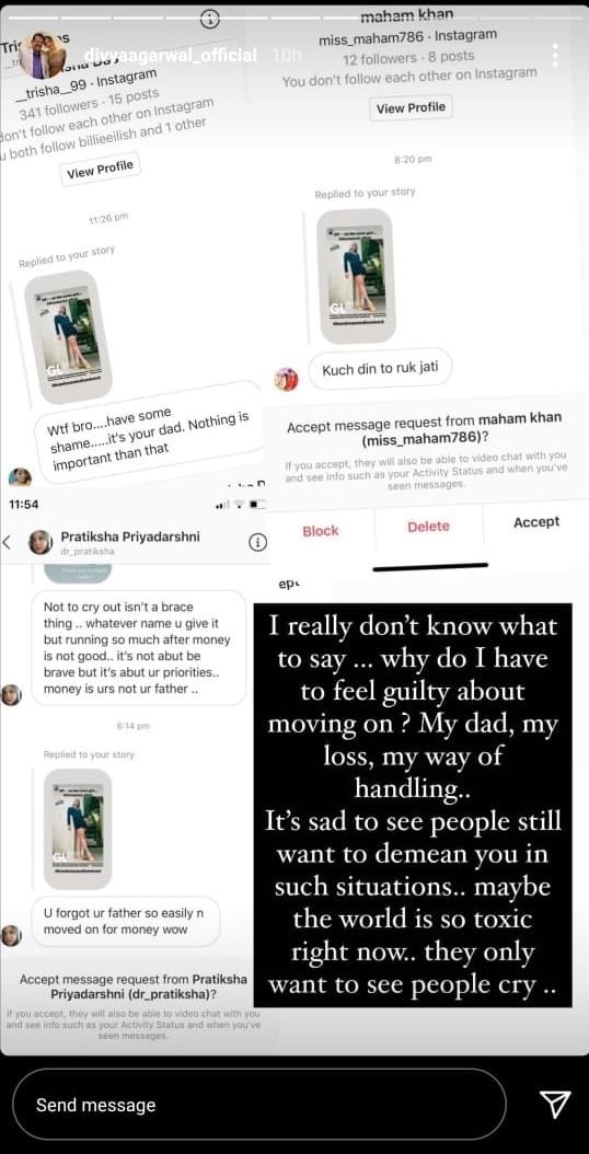 ट्रोलर्स को जवाब देते हुए दिव्या ने कई मैसेजेस के स्क्रीनशॉट साझा करते हुए लिखा, 'मुझे वाकई नहीं पता क्या कहना चाहिए। मुझे मूव ऑन करने पर क्यों शर्मिंदगी होनी चाहिए। मेरे पिता, मेरा नुकसान, मेरा हैंडल करने का तरीका। ये देखना काफी दुखद है कि लोग इस कंडीशन में भी नीचा दिखाना चाहते हैं।'