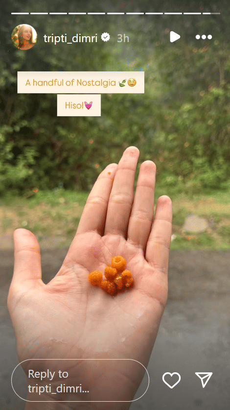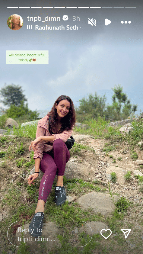 फिल्म 'स्पिरिट' में साइन किए जाने के बाद तृप्ति की खुशी सातवें आसमान पर है। इस बीच वे हाल ही में पहाड़ों पर छुट्टियां मनाने पहुंची हैं। आज मंगलवार को उन्होंने अपनी इंस्टाग्राम स्टोरी पर वेकेशंस की झलक शेयर की है। पहाड़ों पर अपनी यात्रा के दौरान तृप्ति ने पहाड़ी हिसोल (एक तरह की बैरीज) की फोटो भी शेयर की।