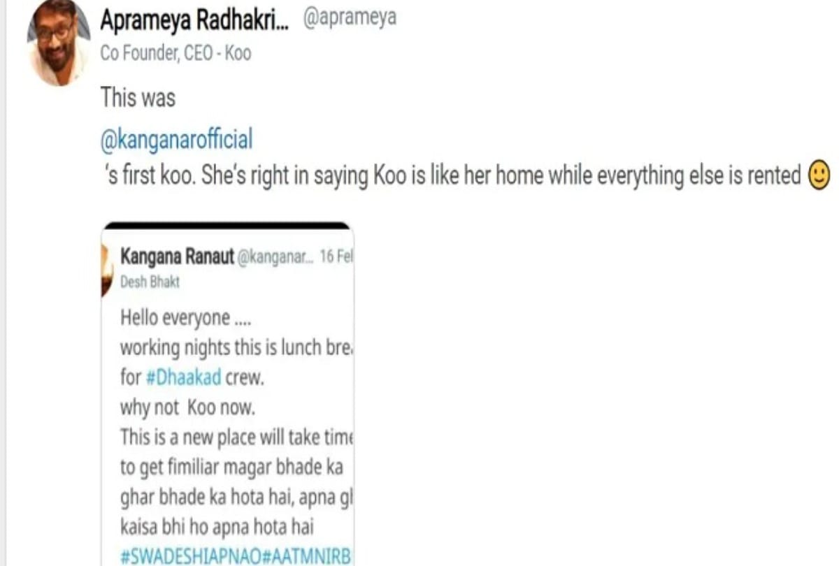 कू ऐप के सीईओ और सह-संस्थापक अप्रमेय राधाकृष्णा ने एक्ट्रेस का अपने प्लेटफॉर्म पर स्वागत किया है। कू ऐप के सीईओ और को फाउंडर अप्रमेय ने हैंडल पर कंगना रणौत के कू पोस्ट का स्क्रीनशॉट साझा करते हुए लिखा, 'ये कंगना रणौत का पहला कू है। उन्होंने सही कहा था कू उनके घर जैसा है और बाकी सब किराए के घर। कंगना की ये बात बिल्कुल सही है।'