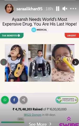 अजय देवगन के साथ साथ सारा अली खान ने भी इस बच्चे की मदद के लिए अपने सोशल मीडिया पर पोस्ट किया है। उन्होंने लिखा है कि 'अयांश को दुनिया की सबसे महंगी दवाई की जरूरत है, आप उसकी आखिरी उम्मीद हैं। ' बता दें कि सारा अली खान ने जो तस्वीर साझा की है। उसमें दिख रहा है कि अबतक 16 करोड़ में से 4 करोड़ रुपये जमा हो चुके हैं। जिसके बाद और पैसों की डिमांड जारी है।