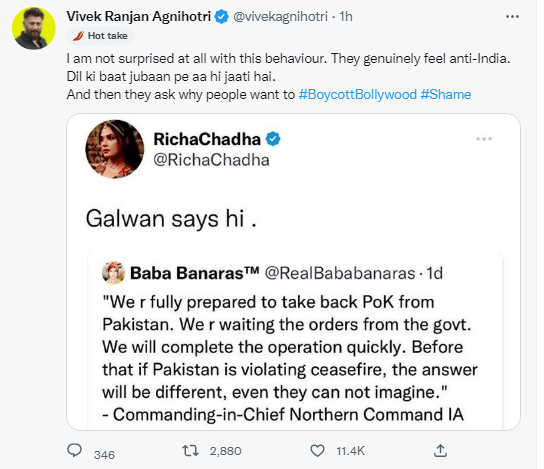 फिल्म 'द कश्मीर फाइल्स' के निर्देशक विवेक अग्निहोत्री ने भी ऋचा चड्ढा पर निशाना साधा है। उन्होंने एक्ट्रेस के इस कमेंट को बॉलीवुड में बायकॉट ट्रेंड से जोड़ा है। उन्होंने ऋचा चड्ढा के वायरल ट्वीट के स्क्रीनशॉट को रिट्वीट करते हुए लिखा, 'इस व्यवहार को देखकर मैं बिल्कुल भी हैरान नहीं हुआ हूं। वो सच में एंटी-इंडिया फील करते हैं। दिल की बात जुबान पर आ ही जाती है और फिर ये पूछते हैं कि लोग बॉलीवुड को बायकॉट क्यों करना चाहते हैं।'