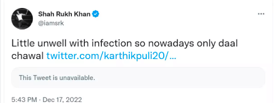 दरअसल, इन दिनों शाहरुख खान इंफेक्शन की वजह से परेशान चल रहे हैं और ऐसे में उन्हें एक डाइट फॉलो करनी पड़ रही है। एक फैन ने अभिनेता से उनकी खाने की आदत के बारे में सवाल किया था, 'जिस पर जवाब देते हुए उन्होंने कहा, इंफेक्शन के चलते इन दिनों तबीयत थोड़ी ठीक नहीं हैं इसलिए सिर्फ दाल-चावल खा रहा हूं।'