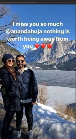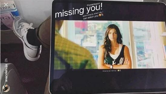 आनंद आहूजा ने अपने इंस्टाग्राम स्टोरी पर एक तस्वीर शेयर की है जिसमें वह सोनम कपूर की फिल्म आई हेट लव स्टोरी देख रहे हैं। कैप्शन में आनंद ने लिखा- 'सोनम कपूर तुम्हारी याद आ रही है। अच्छी बात ये है कि जब तुम्हारी याद आती है तो मैं तुम्हें देख सकता हूं।'