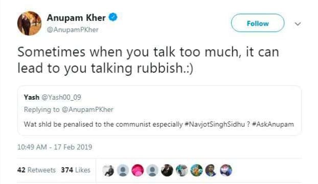 सिद्धू को अपने इस बयान के बाद से सोशल मीडिया पर ट्रोलर्स और आलोचकों का सामना करना पड़ा रहा है। इस बीच बॉलीवुड के दिग्गज कलाकार अनुपम खेर ने भी बयान को लेकर नवजोत सिंह सिद्धू की कड़ी निंदा की है। उन्होंने ट्विटर पर सिद्धू को बकवास करने वाला इंसान बताया। अनुपम खेर ने लिखा- 'इंसान जब ज्यादा बोलता है तो कई बार वो बकवास बोल जाता है'।